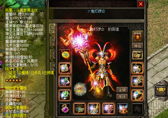 斗战胜佛装备就拿武器来说增加了击破、攻击速度、重击、麻痹时间增加1秒、神圣属性上限等等属性,这些属性在游戏中都是非常实用的,拿战士和刺客来说所加的攻击速度和击破在PK中的作用是很大的,并且还有麻痹时间增加1秒,这些都能成为取胜的关键。